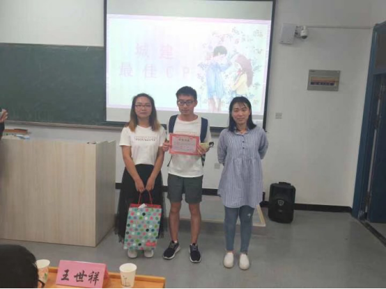 颁奖环节,由胡怡凡老师,夏雨朦老师,王世祥给三对“城建最佳cp”颁奖,他们分别为第14组 刘鑫,杨欣浩;第 9组 游锦煜,许瑶瑶;第17组 张聪慧,陈雯煦。最佳cp代表发言都表示在此次活动中收获颇多,两人之间的了解,交流更多,感情也有加深!有一对cp用视频回顾了他们这七天的故事,每一个甜蜜的瞬间,让人甚是羡慕!最后的游戏环节同样精彩,不仅仅有同学的参与,老师也积极加入,活动在热烈的气氛中圆满结束。
