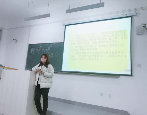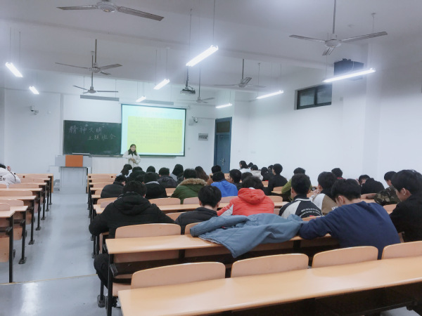 12月4日下午四点在南教304教室我班同学在辅导员胡怡凡老师的带领下举行了以精神文明建设为主题的班会。