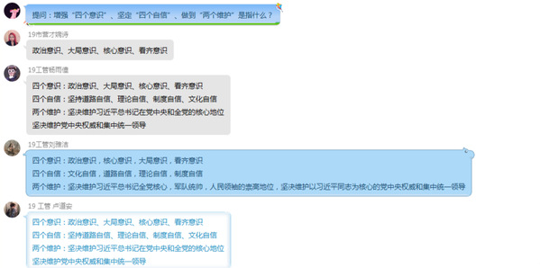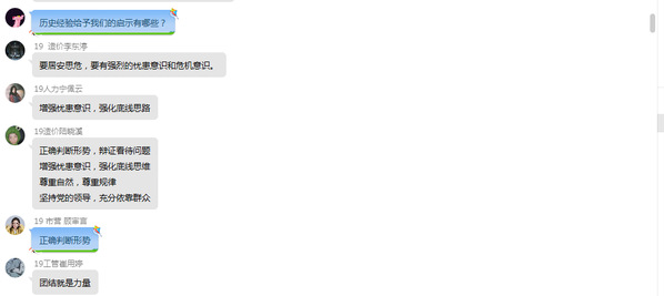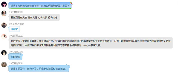本次主题班会有三个环节,分别是回顾思政大课内容、分享印象深刻案例和表扬疫情期间志愿者。第一环节辅导员首先带领大家一起回顾了四位教授的讲授内容:艾四林教授立足中国抗击疫情的具体实践,引导学生深化对马克思主义基本理论的认识、深化对马克思主义中国化最新成果的认识;秦宣教授聚焦于“疫情大考告诉我们什么?”这一问题分析中国抗疫彰显出的中国共产党领导和中国特色社会主义制度的显著优势;王炳林教授则从我国历史上的防疫斗争历程出发,分享从磨难中奋起、化危机为转机的历史经验和智慧;最后,冯秀军教授以战“疫”里的青年责任与担当为主题,深情讲述这场疫情中勇敢逆行的年轻风景,引导大学生群体担当历史使命。大部分同学都认真观看了课程并做了详细的记录。随后,许桐老师根据四位教授的不同演讲主题分别提出了四个问题,同学们在群里各抒己见,积极的发表观点。