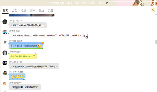 3月9日下午两点半,由教育部社科司与人民网联合组织的“全国大学生同上一堂疫情防控思政大课”开讲,将高校思政课教学优势转化为防疫斗争的强大力量。作为全国2000万大学生的一份子,安徽建筑大学城市建设学院管理工程系学子在各位辅导员老师的组织下同步听讲。两个小时的课程,艾四林、秦宣、王炳林、冯秀军四位教授解读了以习近平同志为核心的党中央关于疫情防控的决策部署,分析了中国抗疫彰显的中国共产党领导和中国特色社会主义制度的显著优势,讲述了防疫战疫一线的感人故事。化疫情为教材,用真实的感人故事传递民族精神,用详实的数据讲述国家力量,引导学生加深对关于生命、关于自然、关于使命、关于奋斗等方面的思考,加深构建正确的世界观、人生观、价值观,坚定青年学生对中国道路、中国理论、中国制度和中国文化的自信。同时,为激发城建学子对此次思政大课的深入学习,进一步增强城建学子的战“疫”必胜信心,管理工程系辅导员许桐老师通过QQ群直播的形式,给19级造价、工管、人力和市营4个专业的同学召开了一场线上主题班会。在班会上,同学纷纷表示在这堂“特别”的思政课之后受益匪浅,也有很多想法和感触。许桐老师组织各专业分享观看感想,确保学习过程中有思考、有感悟、有收获。