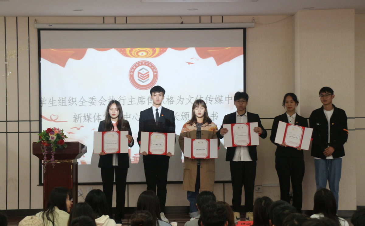其次,张荣荣老师为第六届学生组织全委会指导老师刘玉林颁发聘书,刘玉林老师为第六届主席团颁发聘书,学生组织全委会执行主席傅承格、吴辰为各部门执行部长颁发聘书,代理执行主席李晴为第六届干事代表颁发聘书。