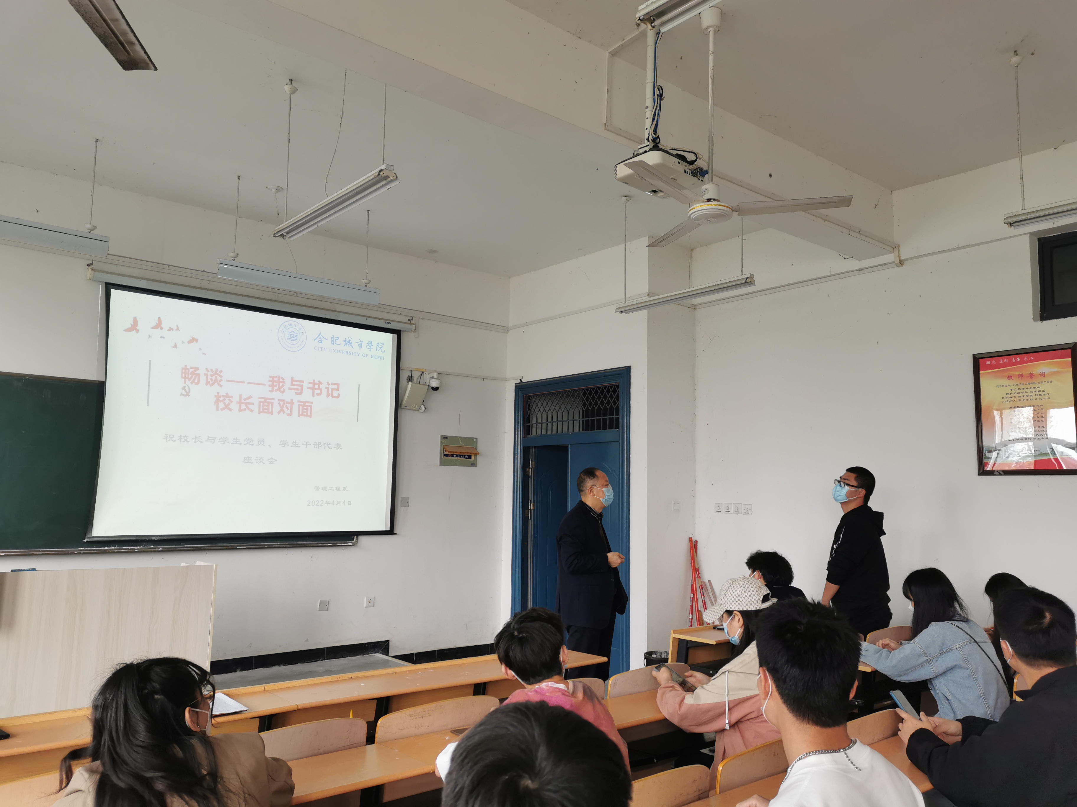 为贯彻落实全省改进工作作风为民办实事为企优环境大会精神,根据校党委工作部署,2022年4月4日下午,管理工程系在南教104,开展“畅谈——我与书记校长面对面”活动——校长与学生党员、学生干部代表面对面座谈会。祝家贵校长、管理工程系党总支书记罗丽、系主任助理靳松、张荣荣等同志与16个班级的48名学生党员、学生干部代表参加了此次座谈会,会议由系主任助理靳松同志主持。