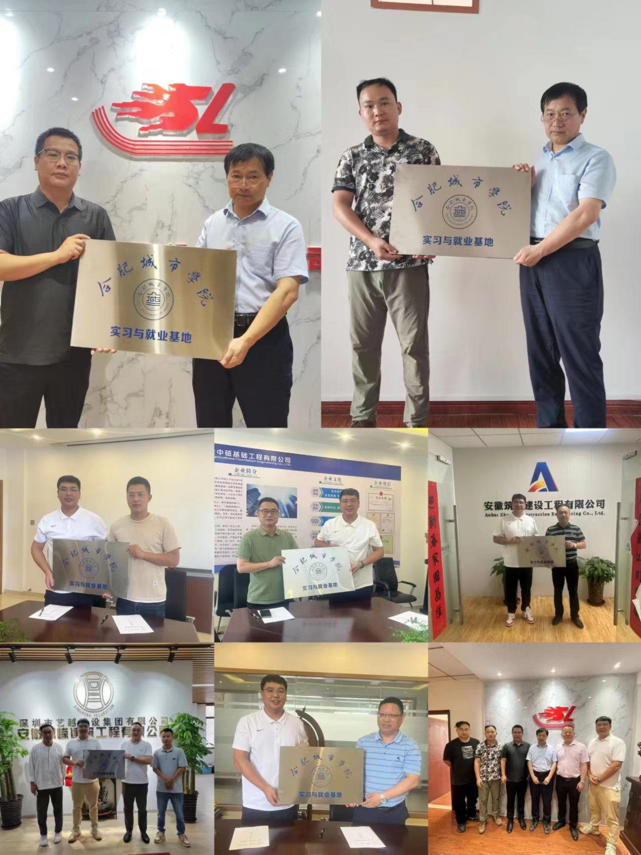 曹泽、周世敏分别与蓉诚工程咨询有限公司、安徽实力体育科技有限公司、安徽搏凡建设有限公司、安徽鼎嵘建筑工程有限公司、安徽优皖建设工程有限公司、安徽持之恒工程管理有限公司、安徽中逵建设有限公司、安徽中砥基础工程有限公司、安徽尚望建设工程有限公司、安徽筑墩建设工程有限公司签订校企合作协议,授牌并合影留念。