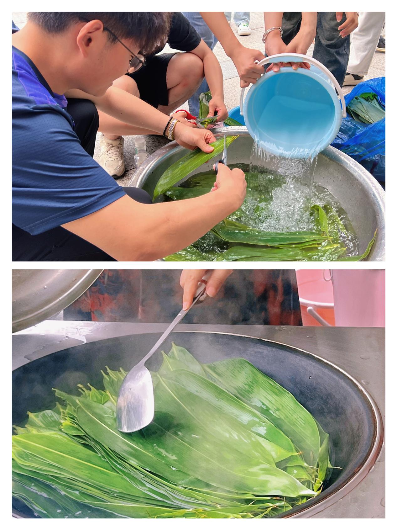 经济与管理学院学生第七党支部和伙管会的同学们带着粽叶、糯米和红枣等到党群中心,大家围成一圈,手把手互相教学。在端午节文化知识大比拼有奖问答中,引导同学们了解端午节的文化内涵,在比赛环节大家热情高涨,村民们纷纷参加到包粽子比赛中来。烫粽叶、洗粽叶、折粽叶、做成漏斗状、装糯米、放蜜枣、压紧口、封口、扎绳,巧手翻飞,一片片清香的粽叶,一粒粒晶莹的糯米,在欢声笑语中,大家用灵巧的手包出形态各异的粽子。有尖尖三角的,传统四角的,细细长长的,一个个可爱、鲜绿的粽子就这么诞生了,浓浓的端午节气氛扑面而来,这甜甜的粽香连起了党群和谐的优美旋律,形成了和睦互助的好风气,唱响党群和谐的最强音。