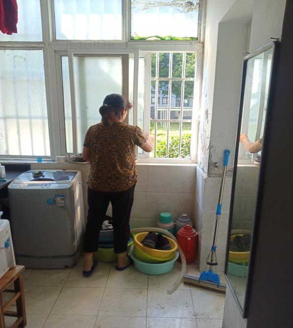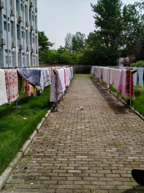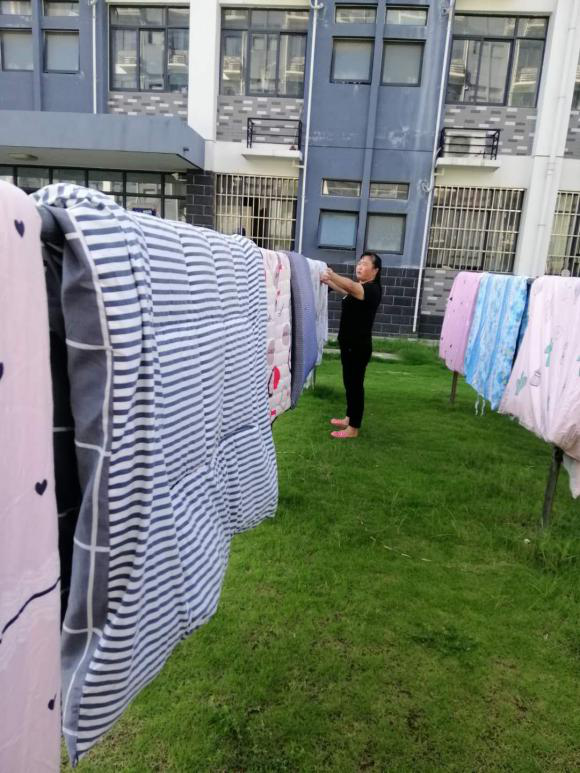 后勤保卫处从4月初开始,一直安排宿管阿姨们利用天气晴朗日为宿舍打开窗户,实施通风除霉。但进入梅雨季节,又遭遇了一个多月的阴雨天气。8月3日终于有所放晴,后勤保卫处抓住时机,立即安排宿管员开窗通风,同时向同学们下发了征求是否可以动褥晾晒的意见,在得到学生个人允许后,8月5日,组织宿管员开始为学生们晾晒被子。