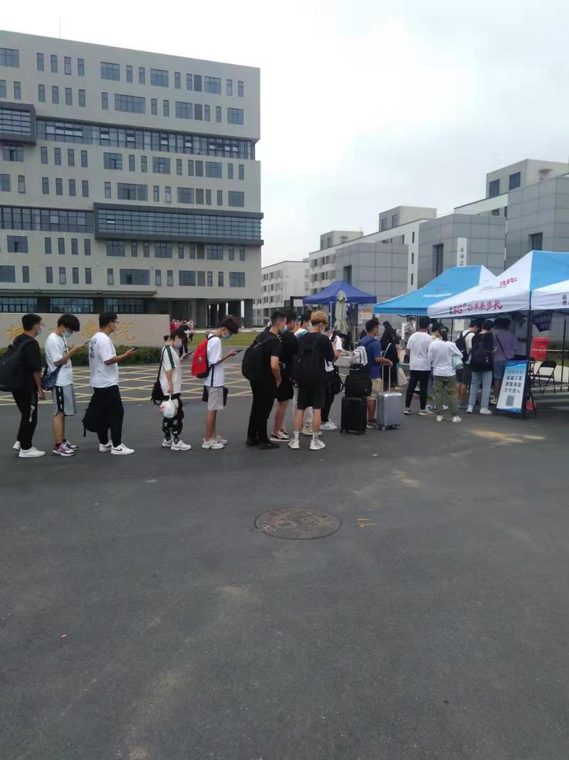 在北城校区南门,前来报到的学生在工作人员的引导下,佩戴口罩、间隔1米以上,有序穿过星空在线注册(中国)官方网站-注册登录闸门,进入学生返校专用通道,在完成体温测量、核酸检测报告查验、二码查验后、行李消杀等流程后,进入久违的校园。