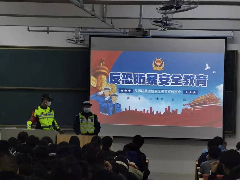 我院后勤保卫处联合岗集镇交警中队在北城校区开展校园“反恐防暴”安全知识宣传教育活动。本次教育宣传活内容涉及恐怖主义的基本概念、形式、危害,中华人民共和国反恐怖法以及公民如何防范恐怖袭击等内容,通过现场讲解、发放宣传手册、关注合肥反恐微信公众号等形式开展宣传教育工作。