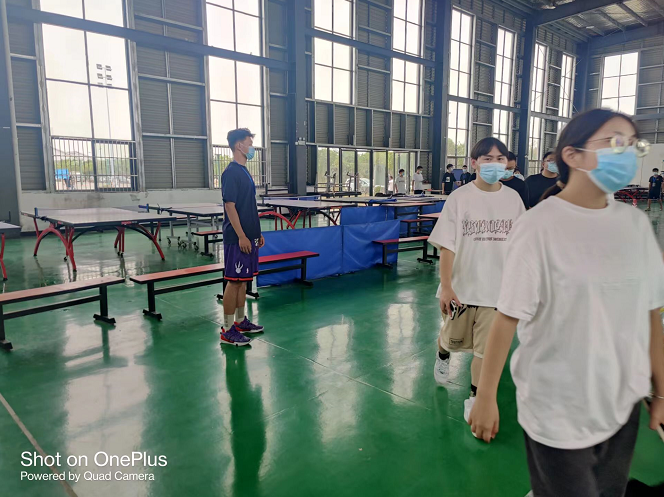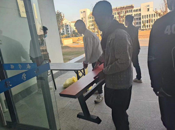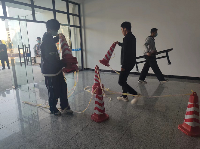 在此期间,每天12点刘文锋就和校卫队员提前布置场地、设置警戒带和安全检测通道等,引导学生佩戴好口罩分批在检测点外有序排队进入,按照1米间距指引,依次排队扫码、核酸采样、安全离开离场,确保核酸采样工作井然有序地进行。