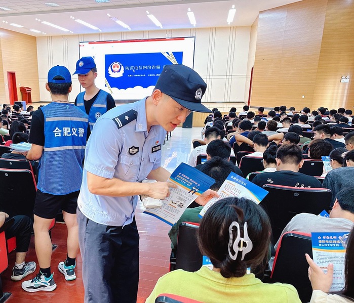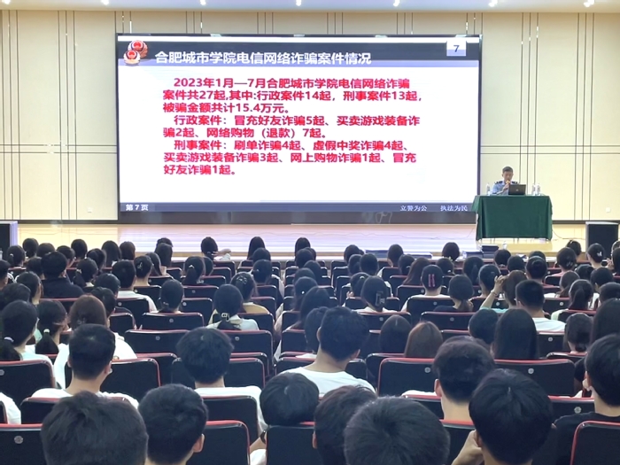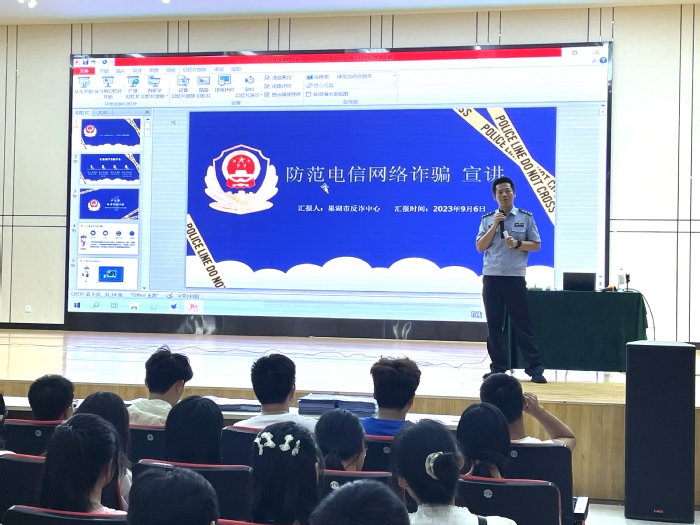 9月6日,我校分别邀请巢湖市公安局反诈中心、黄麓派出所、岗集派出所在星空在线注册(中国)官方网站-注册登录滨湖、北城两校区联合开展2023级新生“防诈骗宣传讲座”,本次活动分别由后勤保卫处处长祝杰、副处长蒯智林主持,举办了八场,2490名同学参加了讲座活动,本次主讲:巢湖市公安局反诈中心主任程成、黄麓派出所警官赵飞鸿、岗集派出所警官刘剑。