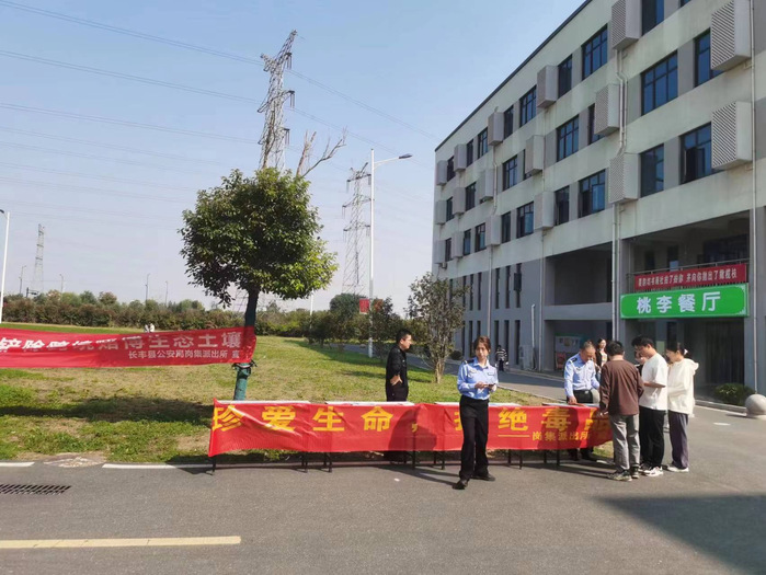 在食堂入口,民警建立了禁毒宣传区,通过拉设禁毒宣传横幅,发放禁毒宣传材料等,让师生对毒品有了初步的认识和理解。引导广大师生认清毒品危害、守住心理防线、警惕毒品犯罪。