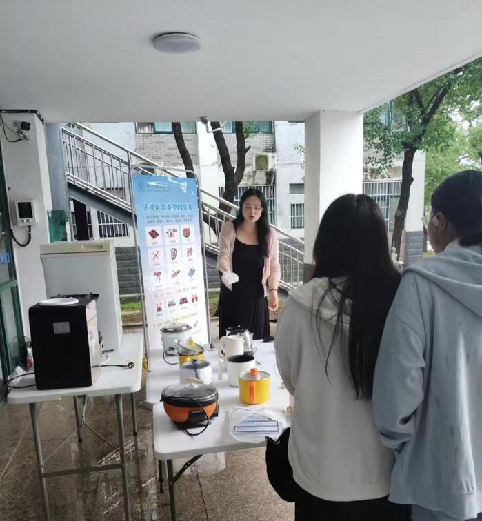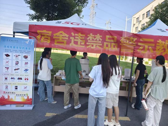 活动现场,后勤保卫处宿管中心精心布置专题展示区,创新采用“实物陈列+图文解读”相结合的方式,将宿舍安全管理规定转化为可感知、易理解的教育内容。展台上,违规电器、明火器具、易燃易爆物品及管制刀具等常见违禁品分类陈列,每件物品均配有清晰标识与风险说明,帮助学生准确识别违禁品类型、理解其潜在危害。展板区系统梳理了违禁品清单,并结合近年来高校发生的典型安全事故案例,通过“现场图片+原因剖析+后果说明”的形式,深入解析违禁品可能引发的严重后果。从“热得快”短路引发火灾,到劣质充电设备导致触电事故,一个个真实案例有效打破了部分学生的侥幸心理,显著增强了警示教育的针对性和说服力。