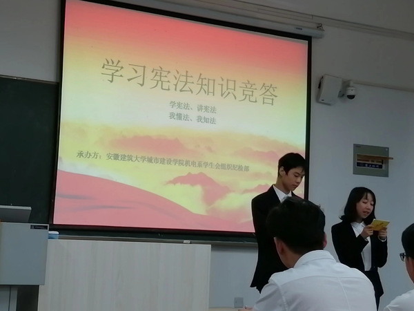 为深入贯彻习近平主席新时代中国特色社会主义思想,学习党的十九大精神,认真落实中央关于深入学习宣传和贯彻宪法,深入展开宪法教育的有关要求,培养学生学法、守法、护法的法制意识,使广大师生深入了解宪法、尊崇宪法,弘扬宪法精神、增强法治观念,安徽建筑大学城市建设学院机械与电气工程系于9月24日在南教106开展“学宪法讲宪法”知识竞赛活动。