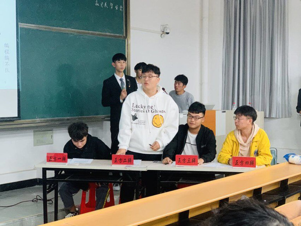 辩论赛场气氛紧张热烈,双方辩手你来我往、侃侃而谈,正方是电子专业组成的超能陆战队,反方是物联网专业组成的编程编不队,在双方进行简约的自我介绍后,比赛正式开始。场下观众激情澎湃,掌声接连不断!