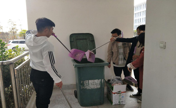 下午三点,参与人员在实验楼下集合,分成两个小组,分配准备好的簸箕和垃圾袋,分别到南楼和北楼为老师们清理办公室以及楼道。