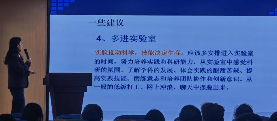最后王教授提出在大学期间应该重点培养的三种能力:适应能力、学习能力、做人和做事的能力。让同学们要扎实学习,消除浮躁心理;全方位接受信息;多和教师交流;多进实验室;克制自己。王教授也对同学们的未来抱有很大的希望,希望同学们以梦为马,不负韶华。