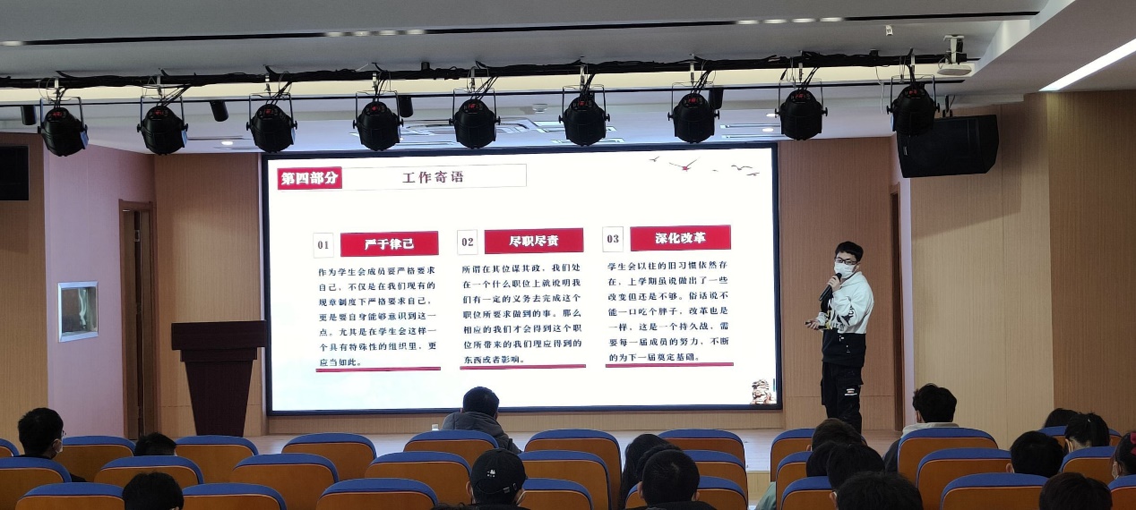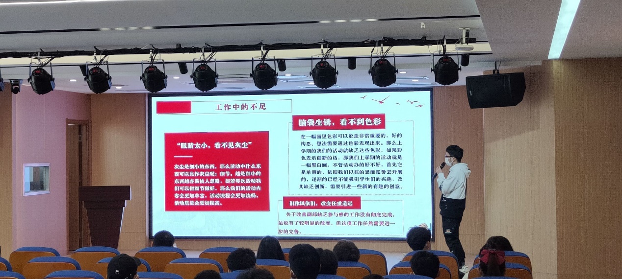 首先,团委老师方陈俊,学生会主席刘俊伟对学生会学年的工作进行总结。学生们的思想和精神生活、校园文化、社会实践等诸多方面得到提升。各个部门都有自己的工作,办公室推动了学生会的运营,使得运转良好;体部负责各种各样的活动,使活动丰富多彩;宣传部则是宣传了大量的活动,可以说是校园里的“小灵通”等。