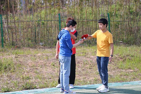 比赛一组共五人参赛,第一项是跳绳接力,每位选手完成跳绳后进入下一项,下一项是大象鼻子转圈圈,转完五人围成一圈跑到下一项,这项是乒乓球接力,五人将球接力传到最后,然后是网球投掷,四人抛球一人接球,完成后两划三猜,最后五人六足,一起冲到终点,用时最短者获得最终的胜利。赛道短短百米却考验着同学们团结协作的能力。