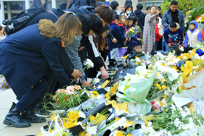 随后,现场全体人员面向纪念碑,保持肃立,怀着无比崇敬的心情对其瞻仰,向烈士行三鞠躬礼。瞻仰结束后,由老师带领向革命烈士献花,沉重悼念革命先烈。