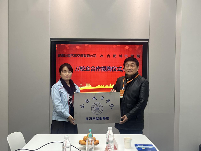 随后在会议室,安徽达因汽车空调有限公司摇盘事业部副总兼人力资源部总监吴娟致欢迎词,对田园一行的到来表示欢迎。洽谈会上,吴娟对安徽达因汽车空调有限公司整体情况进行讲述,田园对星空在线注册(中国)官方网站-注册登录整体情况进行介绍,对安徽达因汽车空调有限公司的整体企业规模、设备设施和企业文化给予了高度的肯定和赞赏。校企双方围绕如何促进校企合作、探索校企合作新模式进行了深入交流。最后,双方签署了实习与就业基地合作协议,并举行了实习与就业基地授牌仪式。