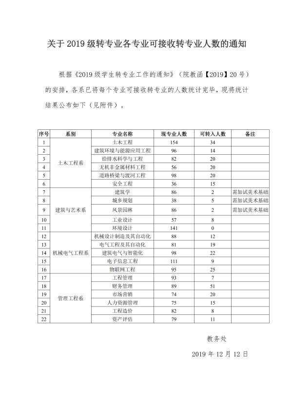 关于2019级转专业各专业可接收转专业人数的通知