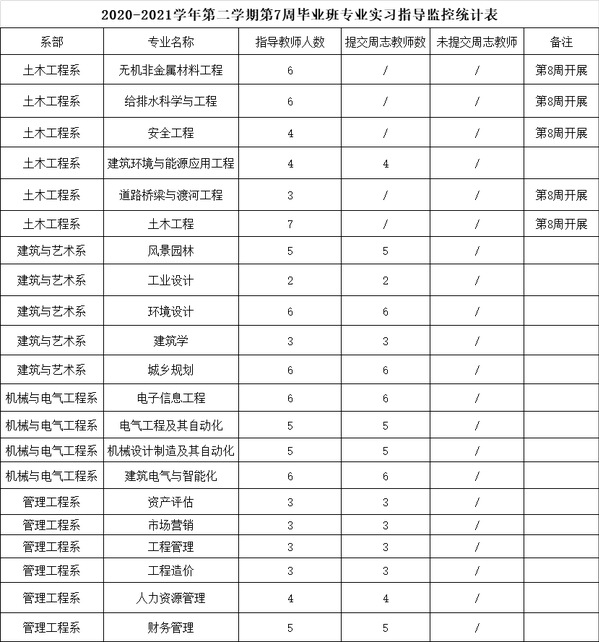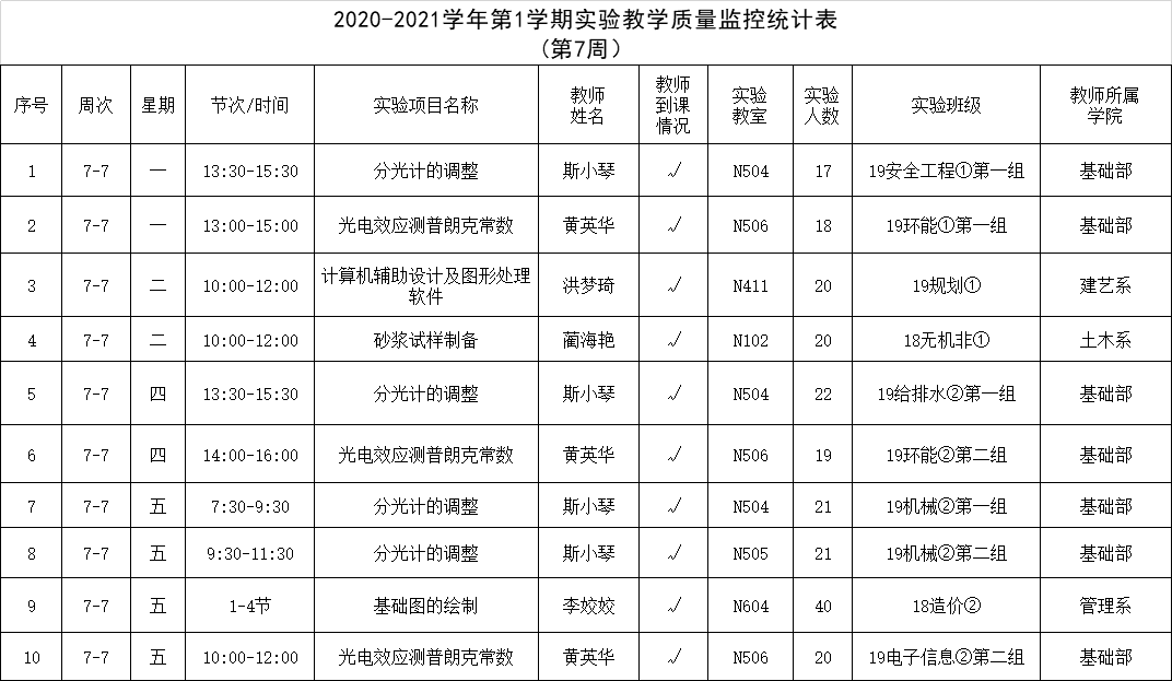 2020-2021学年第1学期第7周实践环节教学质量监控统计表