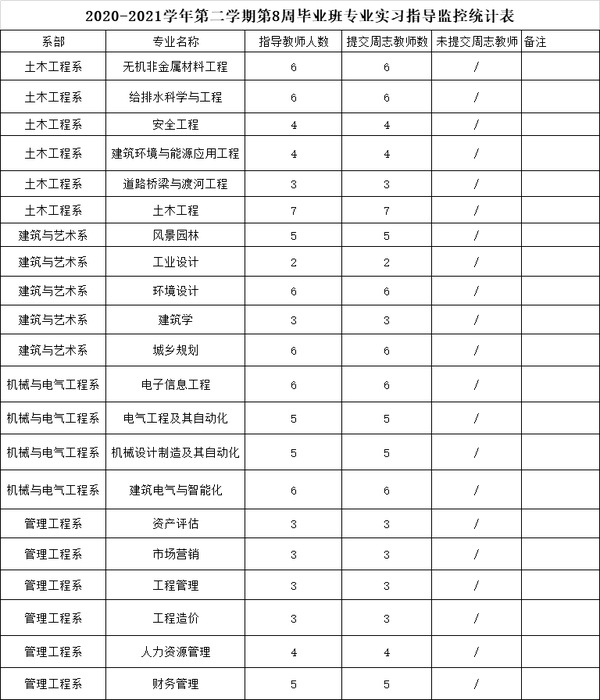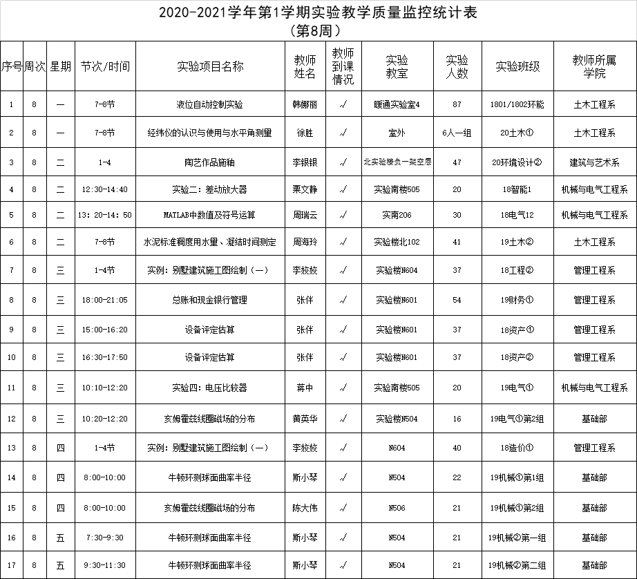 2020-2021学年第1学期第8周实践环节教学质量监控统计表