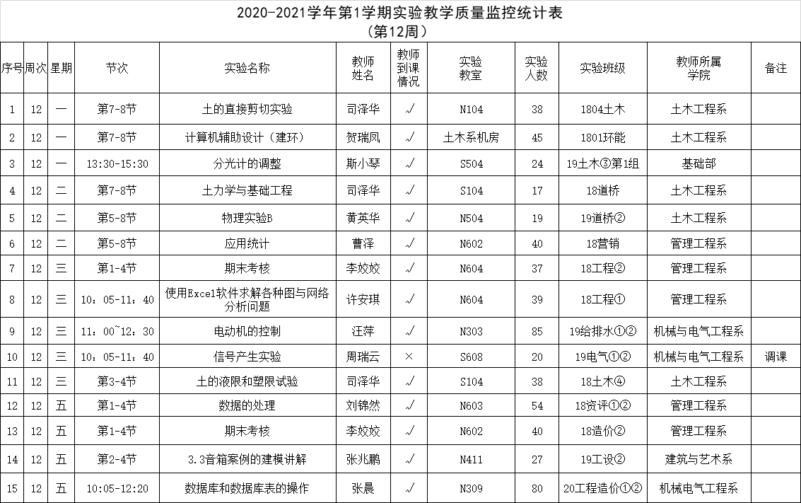 2020-2021学年第1学期第12周实践环节教学质量监控统计表