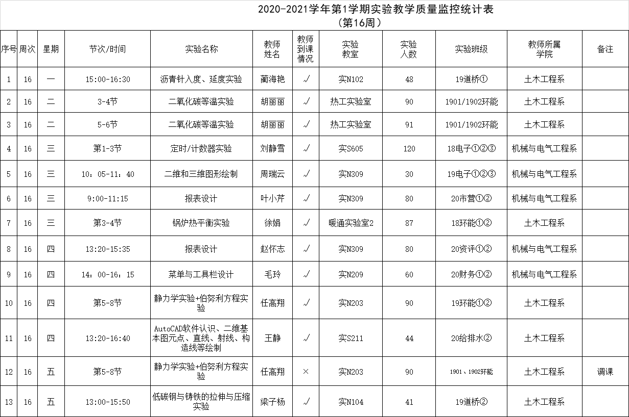 2020-2021学年第1学期第16周实践环节教学质量监控统计表
