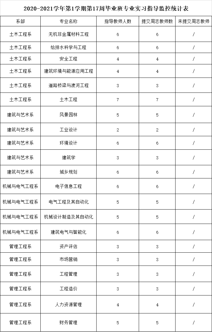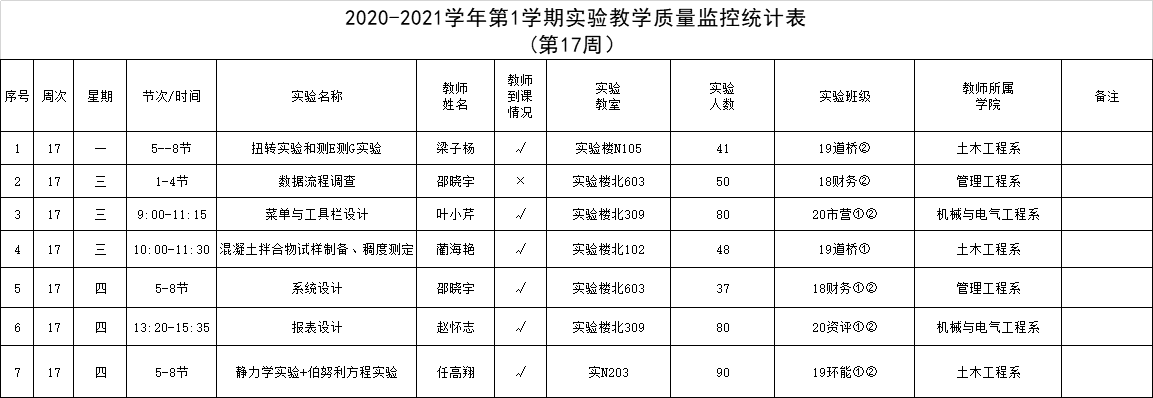 2020-2021学年第1学期第17周实践环节教学质量监控统计表