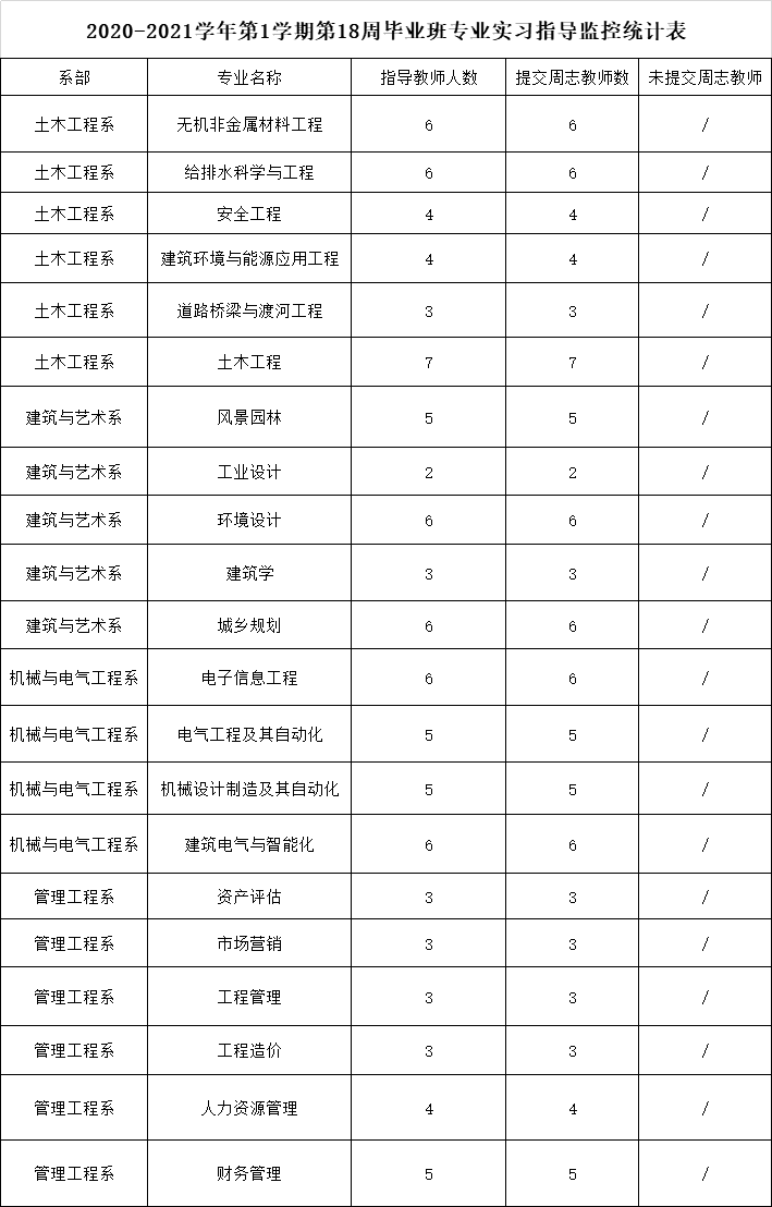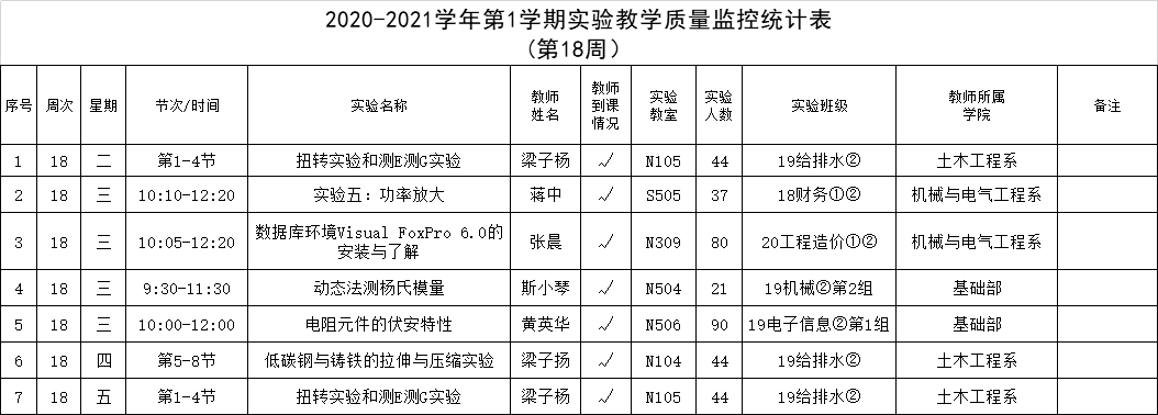2020-2021学年第1学期第18周实践环节教学质量监控统计表