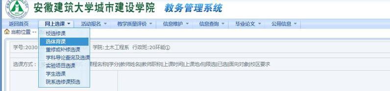 1.进入系统后选择“网上选课”栏,出现下拉菜单,再点击“选体育课”。