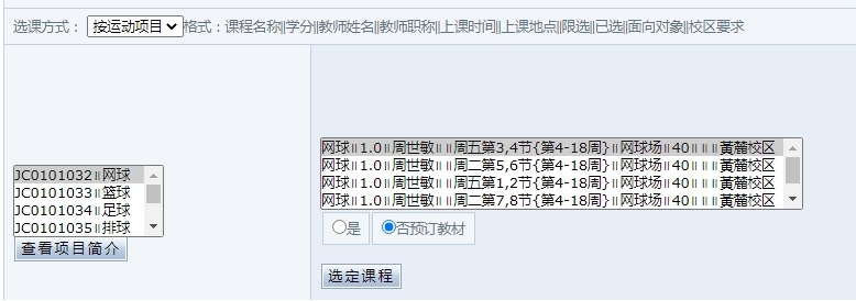 3.根据自己的自由时间段和项目人数余量(限选减已选为余量),选择体育项目。确定要选择的体育项目后,在“可选项目显示区”点击你要选择的项目,点击“否预订教材”前面的圆圈,再点击“