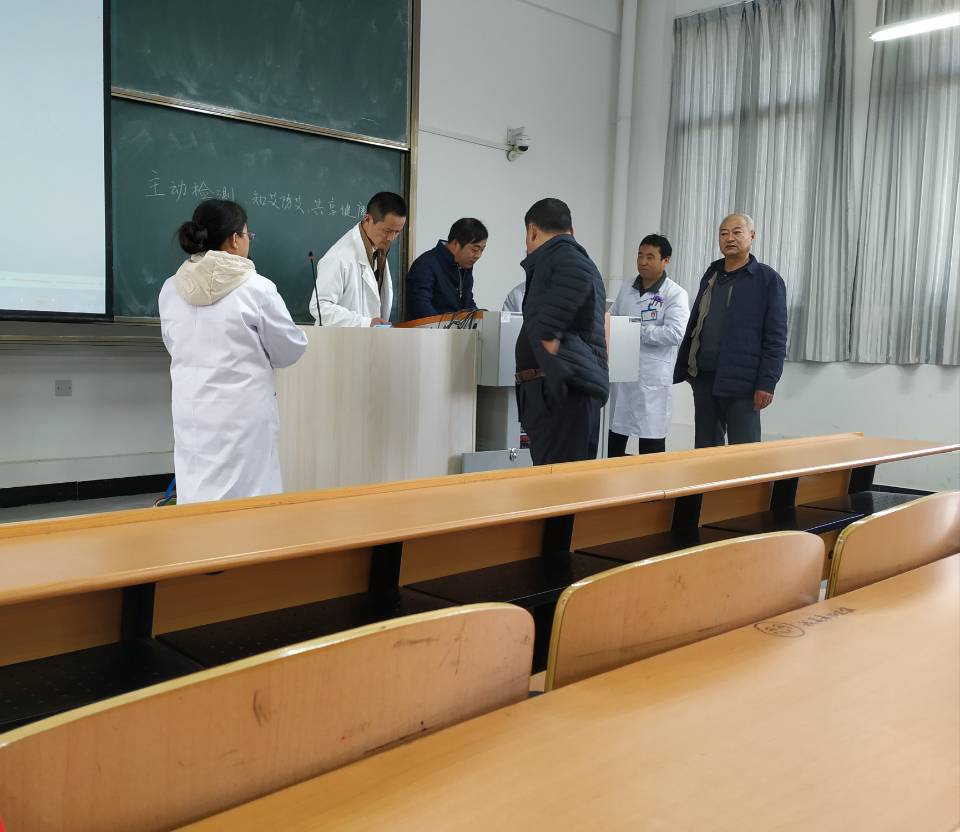 2018年11月29日下午,黄麓镇卫生院的医生们早早来到了安建大城建学院南教108教室,给已经到场的同学们分发宣传海报和宣传知识手册,同学们一开始都有些羞涩,纷纷于后排落座,可在医生们的鼓励下,他们开始陆续移到前排,建筑与艺术系系的同学们表现尤为踊跃,下午两点整,宣传讲座正式开始。