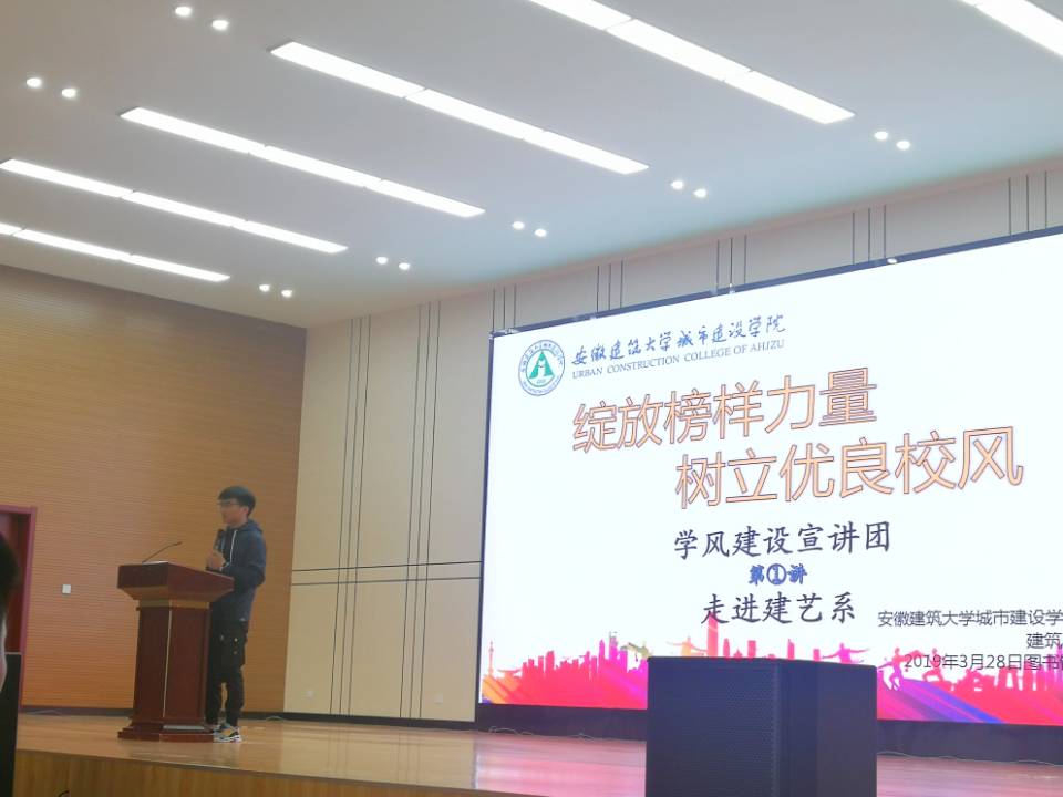 今天下午两点建筑与艺术系于图书馆大礼堂正式举行了学风宣讲会。高宇老师向17、18级到场的同学们介绍了15、16级优秀的学长们。到场演讲的有张景辉、朱涵宇、王敬文,他们分别通过自己平常的考研经历、学习经历,向大家发表了感言。