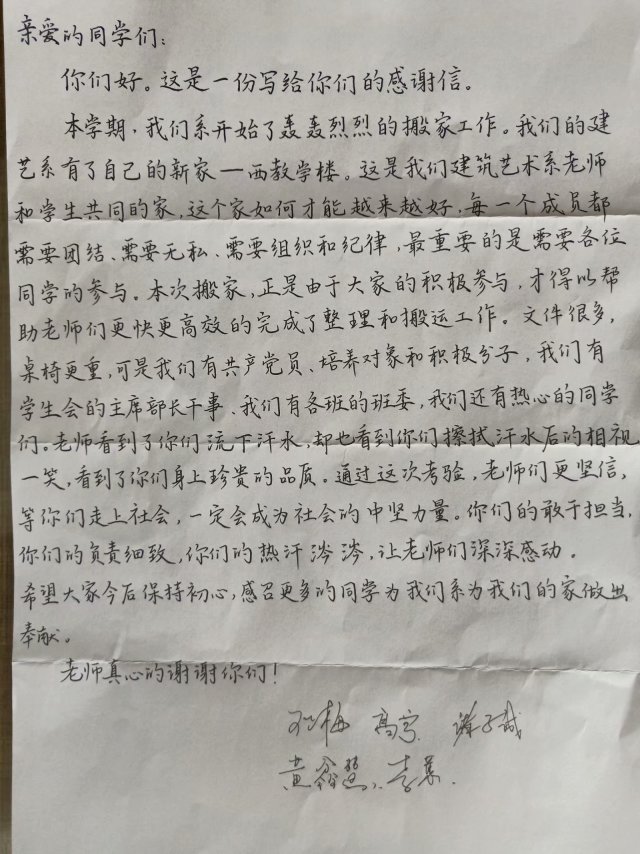 建筑与艺术系为了感谢在搬入西教学楼任务中辛勤付出的所有同学。建艺系学工高宇老师决定特地为大家举行一场感谢会。在此次搬迁任务中的同学在短短的五天的时间内,高效的完成了多批次的搬运,经过同学们细心的整理,将近上千份学生档案、五百份多份教学文件、近百套办公设备等全部都被整齐地放置在了建筑与艺术系的“新家”。所有参与的同学们不辞辛苦,汗流浃背,历尽艰辛将搬运的工作热心出色地完成了。