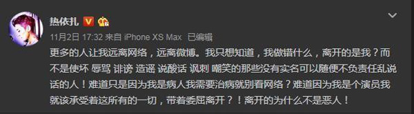 演员热依扎因出演大热剧集《长安十二时辰》近来人气大幅上升。所谓人红是非多,很快网络暴力的矛头就指向了热依扎,网友们因为热依扎患有抑郁症对其诽谤,辱骂,甚至让她远离网络。可是出乎意料,热依扎并没有一再的忍耐,而是发文抗议。