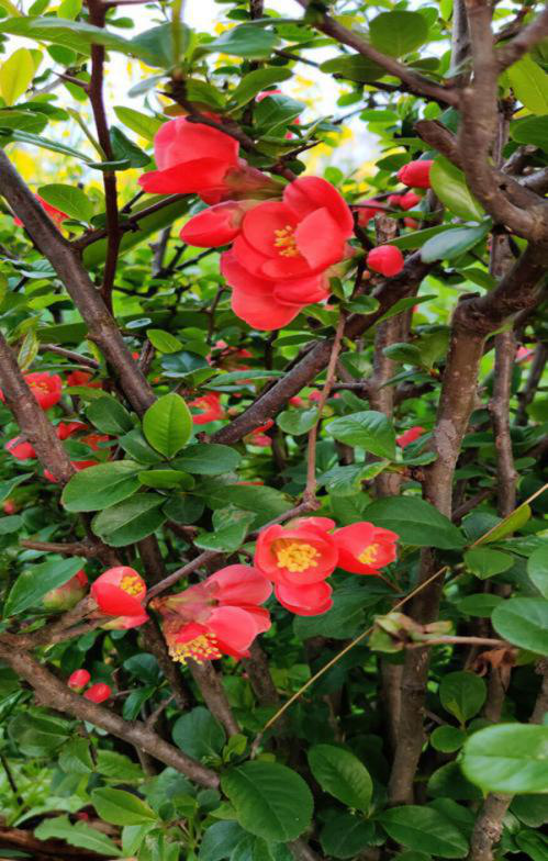 2020年伊始,尽管人们都宅在家里,不出门,春天还是悄悄地来了。屋外的海棠花,不知何时,静静地开放了。齐齐的花蕊,都低着头,红艳艳的,像蒙着红盖头的新娘子。看到它们的时候,忽然之间喜从中来。