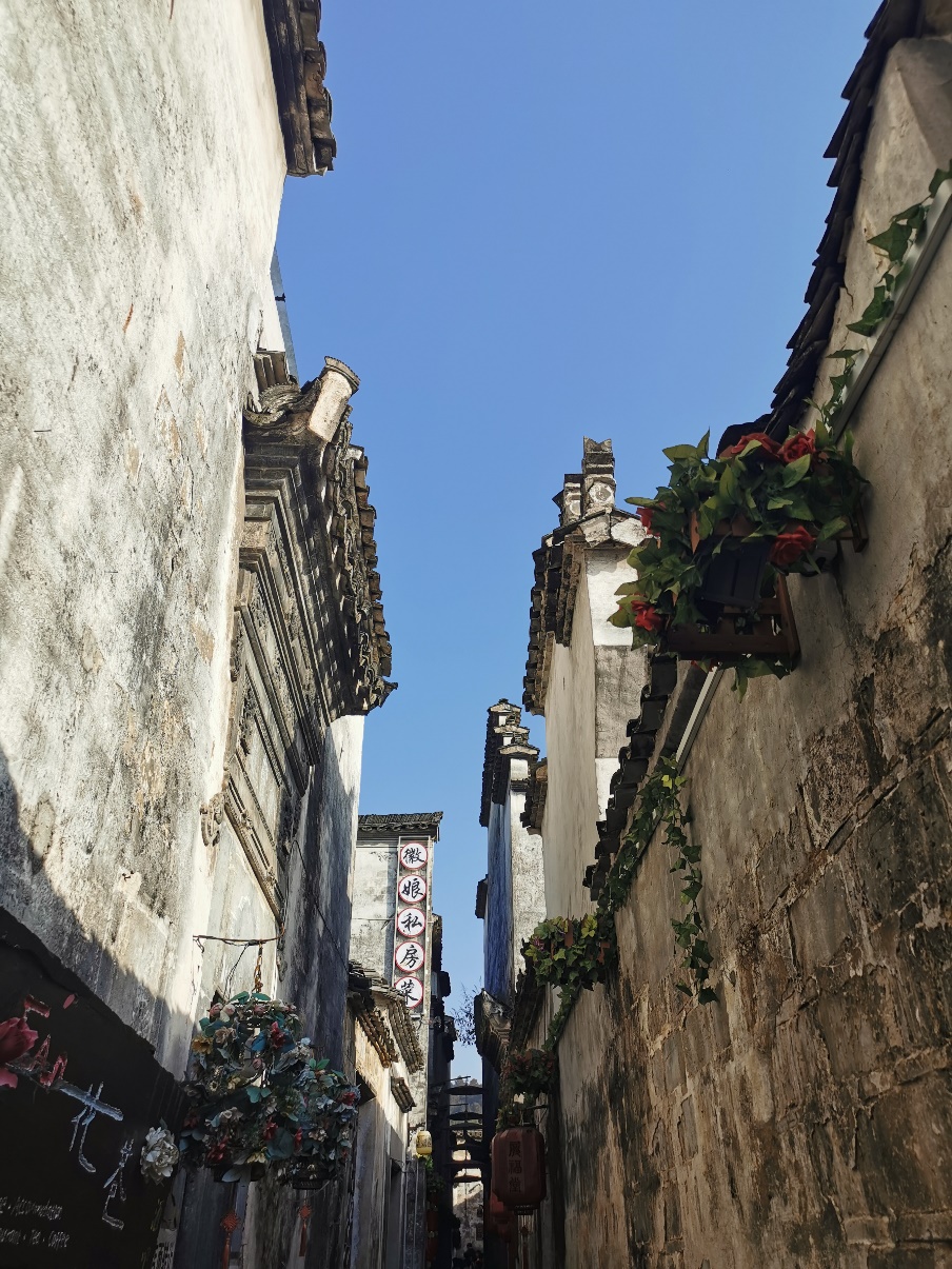 第一天,大家早早地收拾好行李在校门口等待大巴。八点半,大巴出发了,同学们满怀期待,在车上有说有笑,当然也不乏闭目养神的同学。上了高速后,车里逐渐安静了下来,直到进入山区后,同学们从睡梦中醒来,看向窗外连绵不绝的山。过了山路,在下午一点半,抵达目的地:西递。大家将行李放在酒店后,老师带领大家走着写生专用通道到达西递村,之后由导游给大家讲解当地房屋特色、历史人物等。不过,让同学们印象最深的还是马头墙。