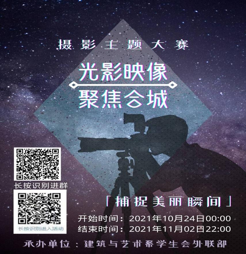 为进一步丰富在校学生文化生活,努力营造积极向上、健康文明的校园文化氛围,加强校园精神文明建设,合肥城学院建筑与艺术系学生会外联部于10月24日在线上举办“光影映像,聚焦合城”主题摄影活动。