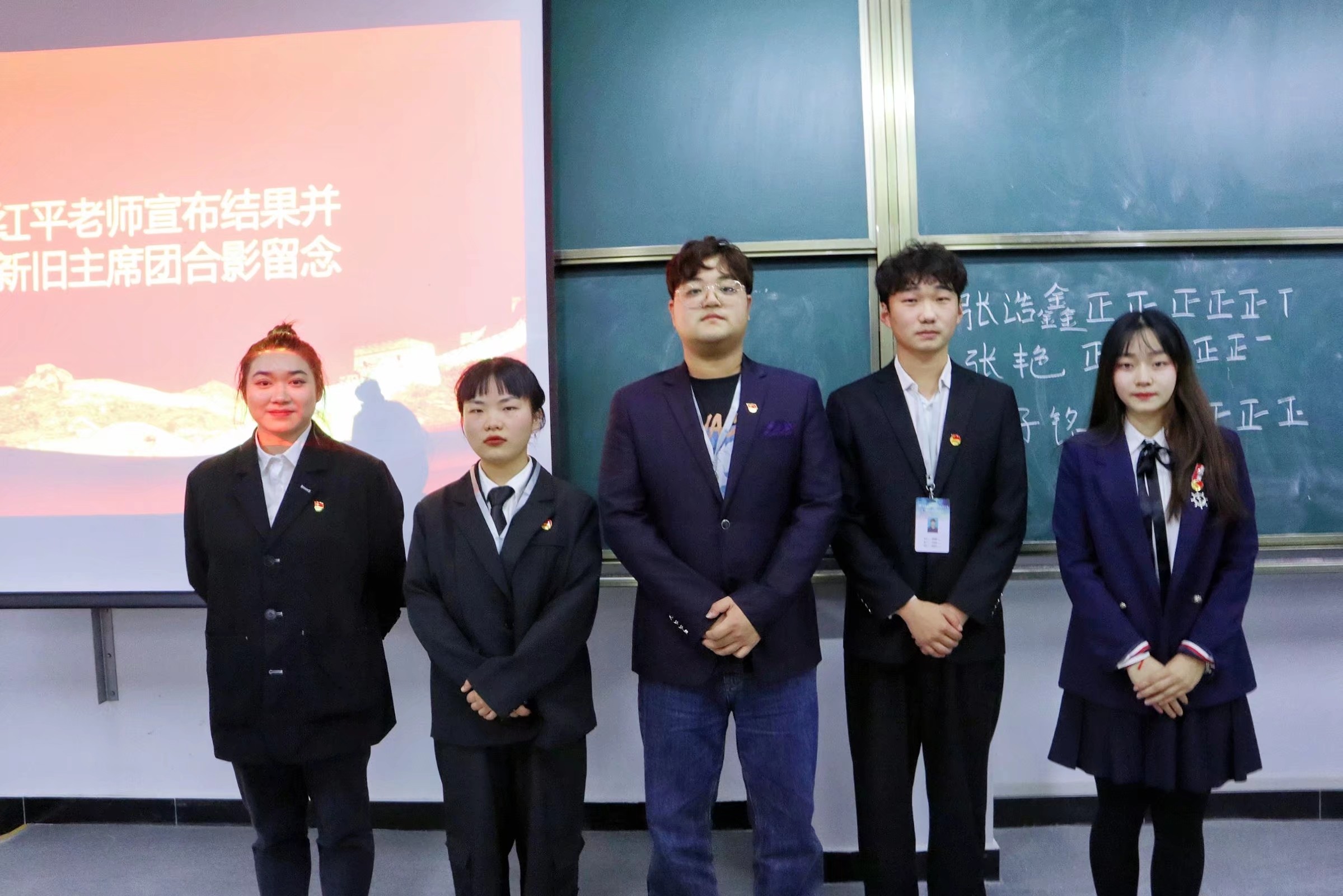 由伍红平老师为18级主席团颁发聘书并合影留念。然后新任轮值副主席张浩鑫、张艳依次上台讲话。