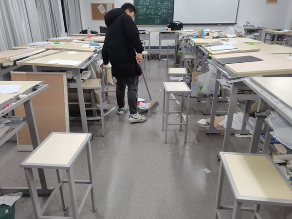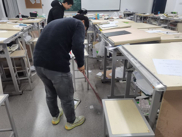 上午九点,建筑与艺术系第一支部、第二支部各学生党员来到西教领取劳动工具,在学生支部书记琚慧老师和朱雅慧老师协助分配好清洁教学楼的工作安排后,学生党员们都争先恐后的各自干了起来。大家发扬不怕脏,不怕累的优良作风和团结协作的精神对西教学楼进行了彻底的清理,学生党员们从教学楼一楼每个教室逐步清理,不放过任何角落。一时间,西教每个角落的废弃物变成了“抢手货”,并渐渐的消失不见了。西教的每一个教室都恢复到了原来整洁干净的面貌了。看着被清扫干净的教室,劳累了一个上午的党员们沉浸在为同学们服务的喜悦中。