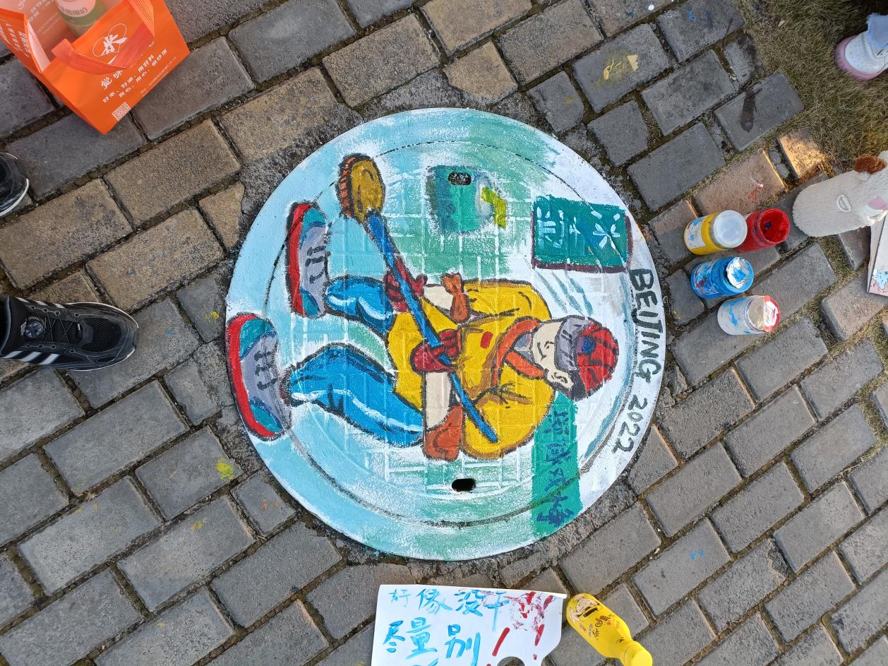 冬奥会对推动中西文化交流融合、增强民族自信产生积极影响。冬奥组的成员细心在井盖上描绘着属于中国运动健儿的那份荣耀。看那奥运健儿们英勇的身姿,鲜红的国旗在运动员们的服装上熠熠生辉,映射着中国的体育水平已经步入世界前列。
