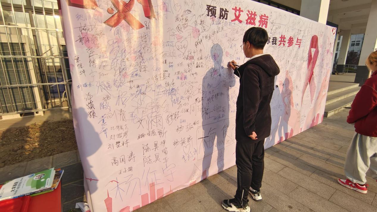 志愿者们还组织了“预防艾滋病,你我共参与”的签名墙活动,签名墙刚刚安装完成,就有许多同学踊跃签名,短短一个下午,这面原本空荡干净的墙上就已经没有了空白的地方。活动现场,志愿者们为师生发放宣传手册,科普艾滋病防治知识。参与活动的同学们在志愿者的引导下,在签名展板上留下自己的姓名,并纷纷表示自己愿意积极参与到艾滋病的日常教育、宣传的队伍中来。