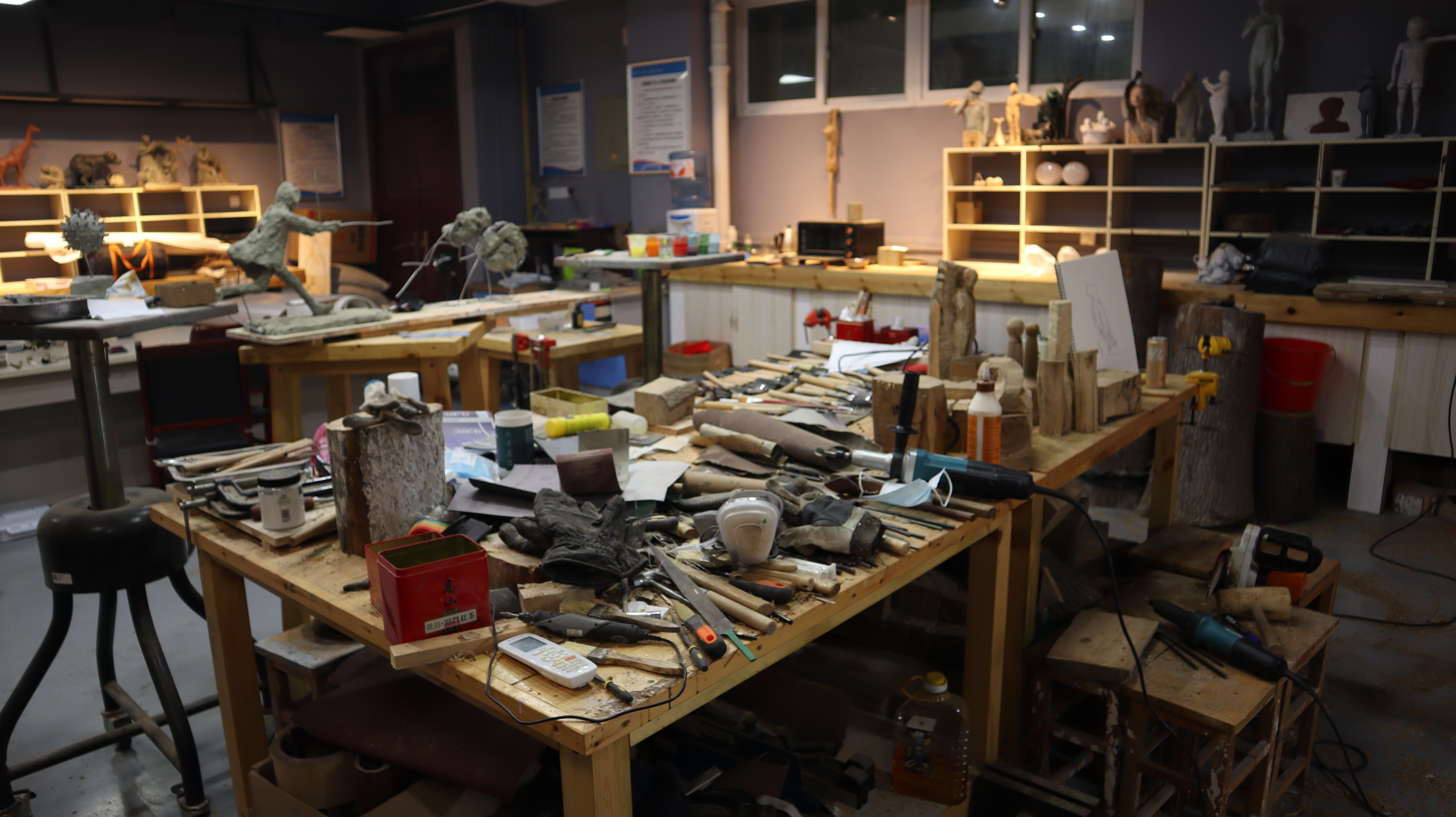 我院雕塑实验室于2016年12月开始建设改造,于2017年5月完成设备采购与室内环境改造。位于实验楼南103室,总面积96㎡。已有的大型设备为泥塑转台3台,浮雕架2台,其余均为消耗品,如水性雕塑泥和油性雕塑泥以及打磨耗材等等。