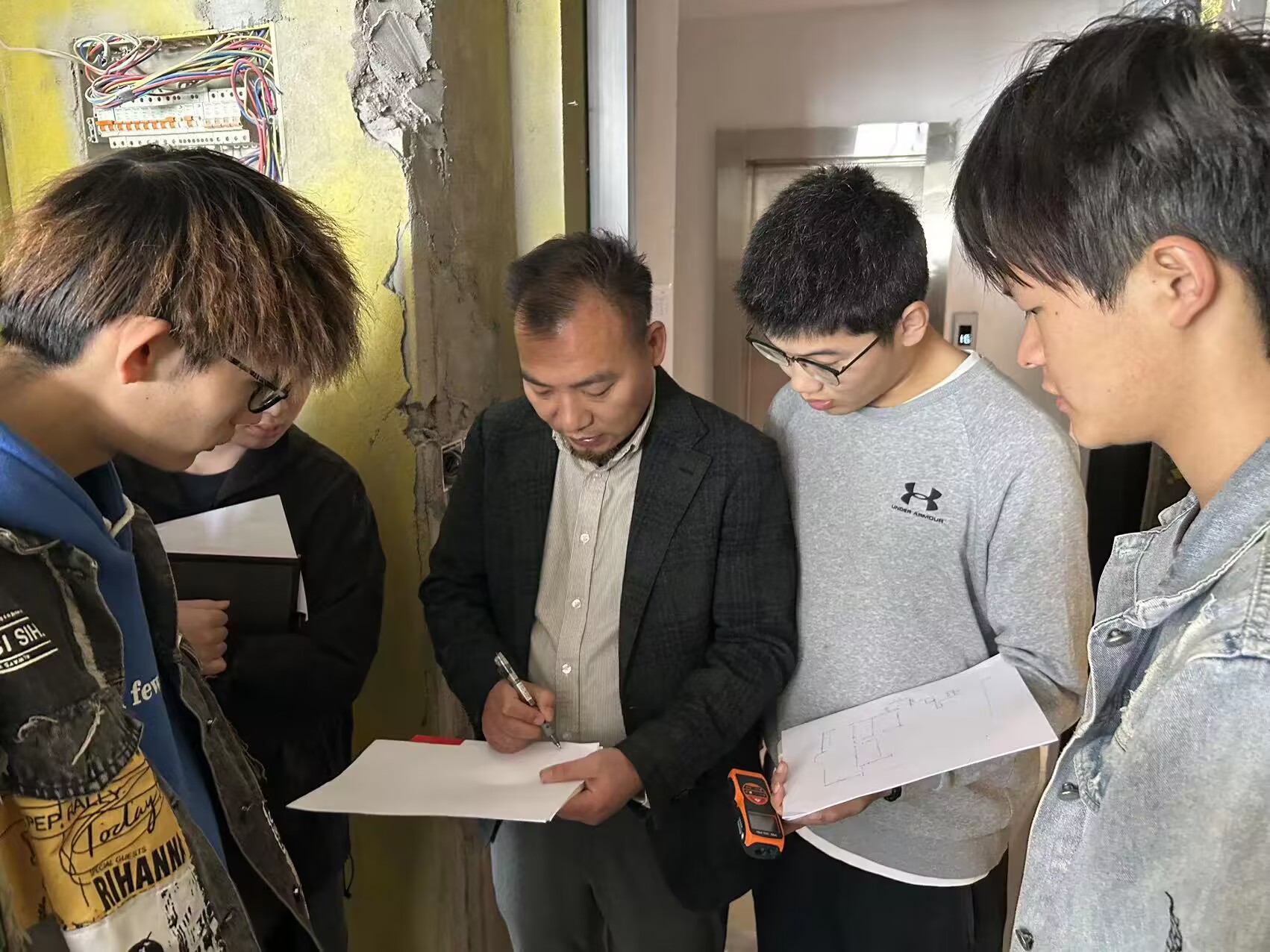 此次现场调研某住宅室内设计,席冬亮老师与汪志刚老师带领同学们通过实地走访、现场测绘,了解室内设计前期工作如何开展,方案设计如何进行,装饰装修工作当中需要掌握的技术手段等专业知识。