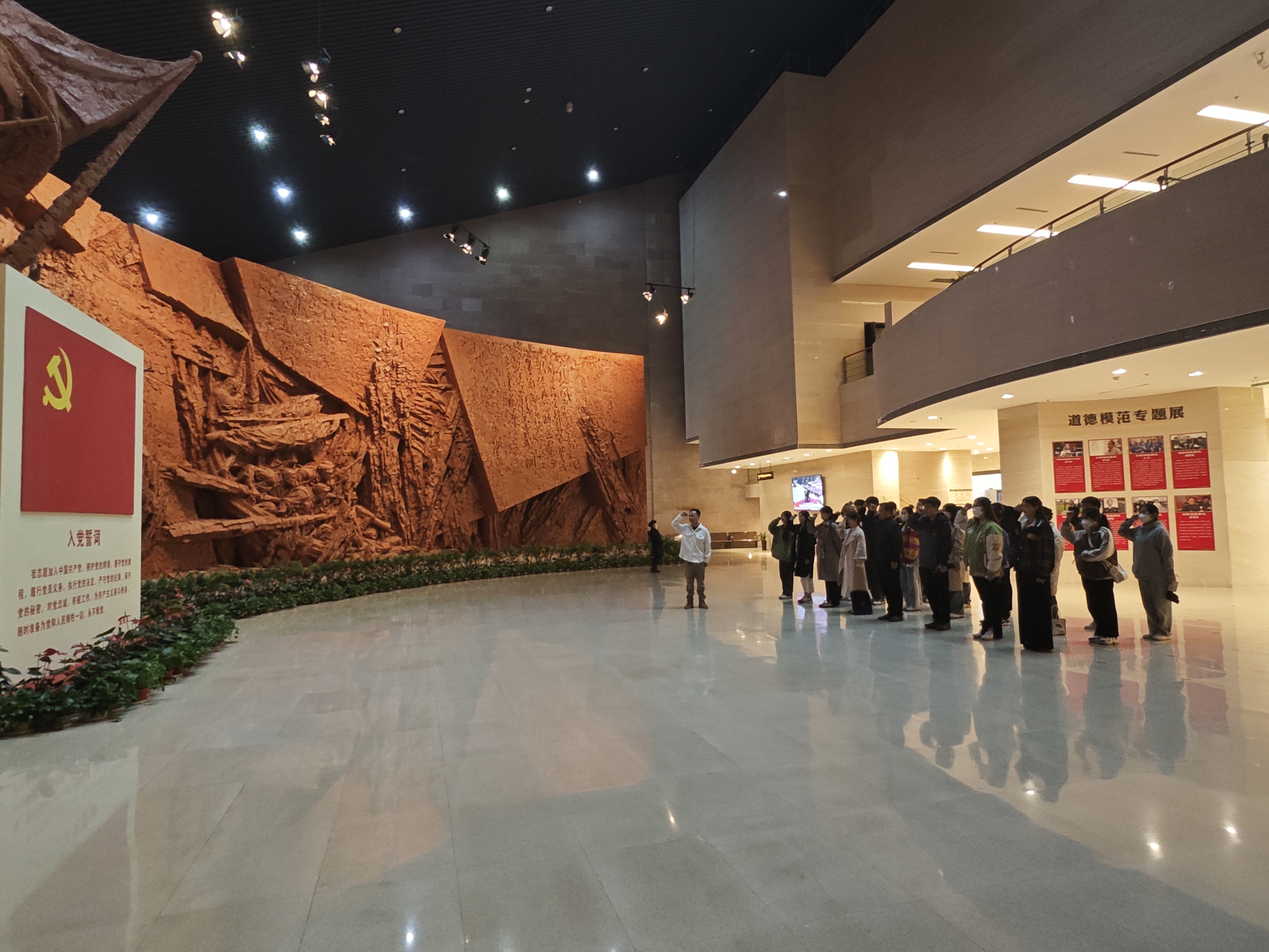 渡江战役纪念馆一楼大厅,面对鲜艳的中国共产党党旗,我院学生第一党支部书记陆帆老师带领大家重温入党誓词。铿锵有力的宣誓声,表达了为党奋斗终身的决心和愿望。