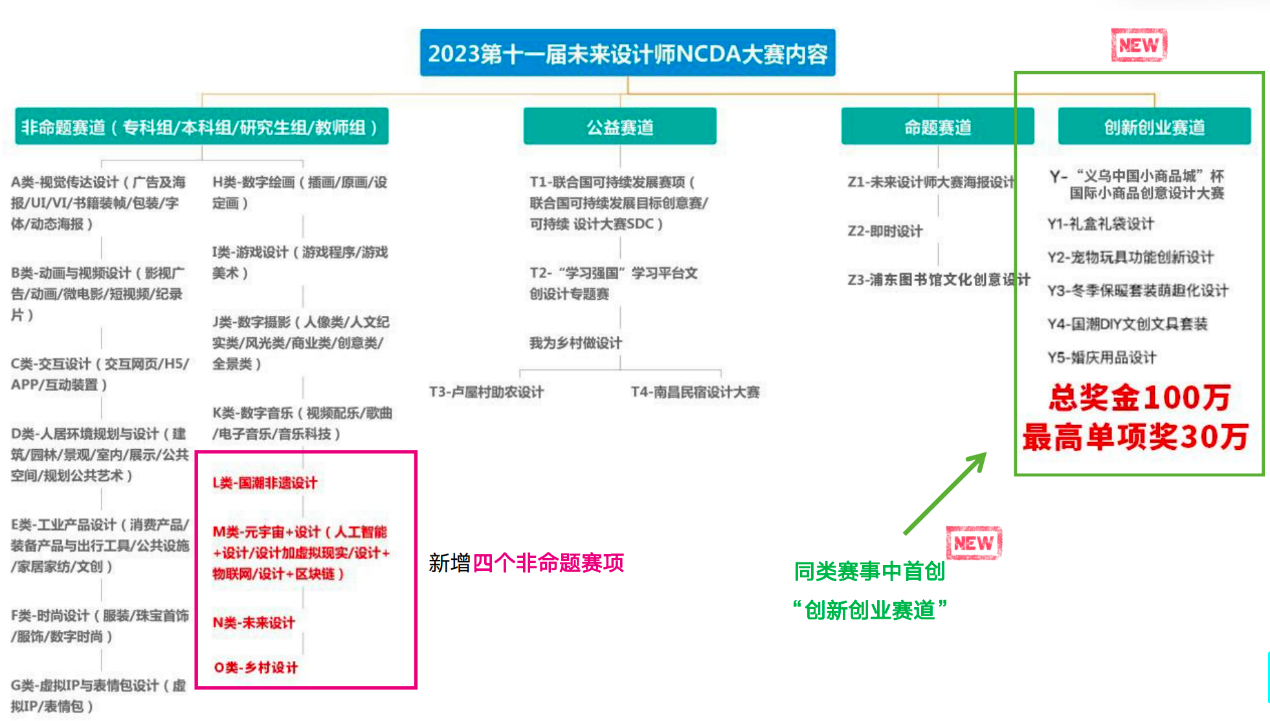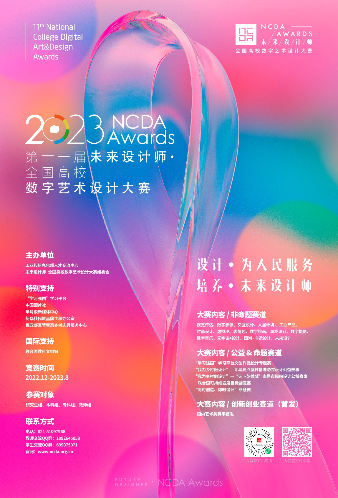 未来设计师·全国高校数字艺术设计大赛(NCDA)是由工信部人才交流中心主办,教育部中国高等教育学会认定,12个省教育厅发文立项,“学习强国”学习平台支持的国家级大学生竞赛。大赛始于2012年,每年举办一届,已连续举办十届,是高校积极参与的重要竞赛之一。每年有1500余所高校参赛,92%的985、一流大学和95%的知名设计院校参赛。比赛设“非命题”“公益”“命题”“创新创业”四个赛道,内容有元宇宙+设计、未来设计、国潮·非遗设计、视觉传达设计、动画与视频设计、交互设计、人居环境与规划设计、工业产品设计、时尚设计、虚拟IP及表情包设计、数字绘画、数字摄影、数字音乐等。