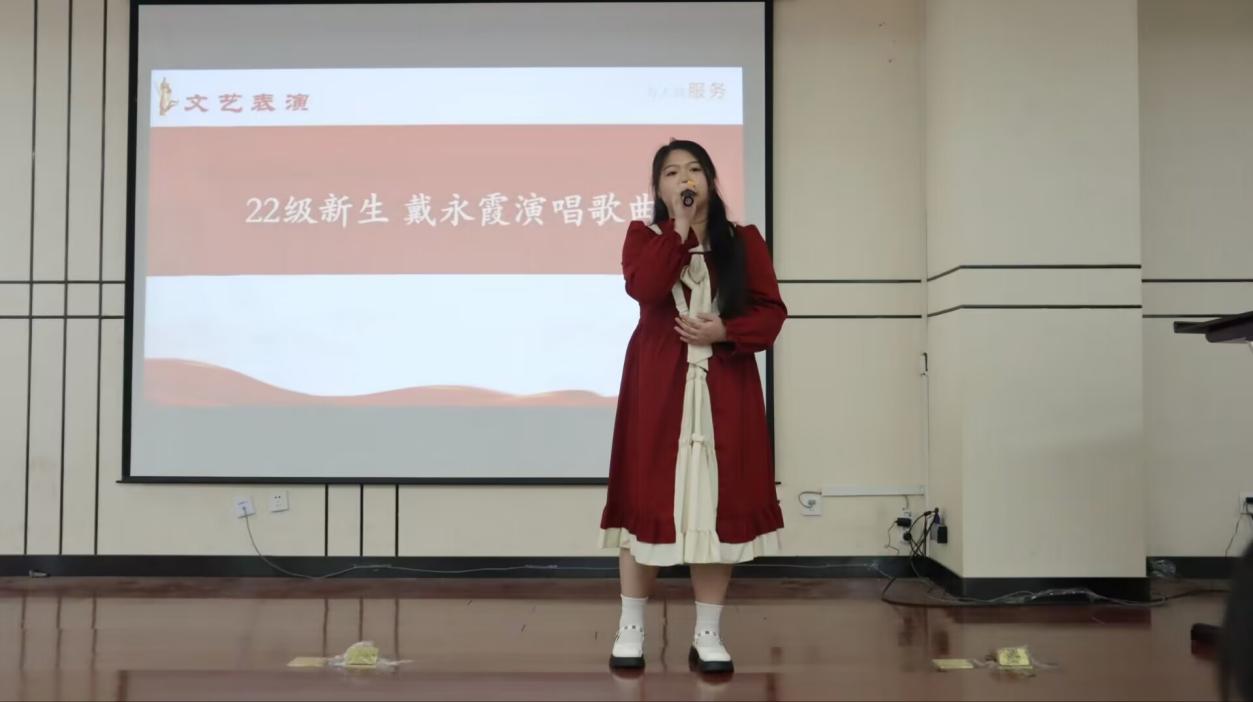 在比赛间隙,现场展示了建筑与艺术学院学习宣传贯彻党的二十大精神学生党员心得体会视频剪影,与此同时,建筑与艺术学院新生代表戴永霞给大家带来了《五四版错位时空》歌曲,歌颂革命先烈故事,感染了大赛观众。