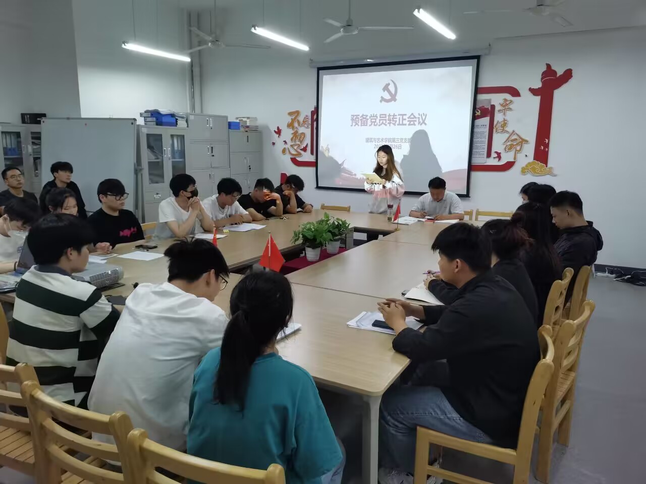 为了给党支部注入“新鲜血液”,响应党的号召,壮大党员队伍,建筑与艺术学院学生第三党支部开展了预备党员转正大会。由于毕业班部分学生党员工作原因,无法到场,故此次大会采用线上与线下相结合的方式进行,会议由学生第三党支部书记童锐老师主持,所有在校党员参加。