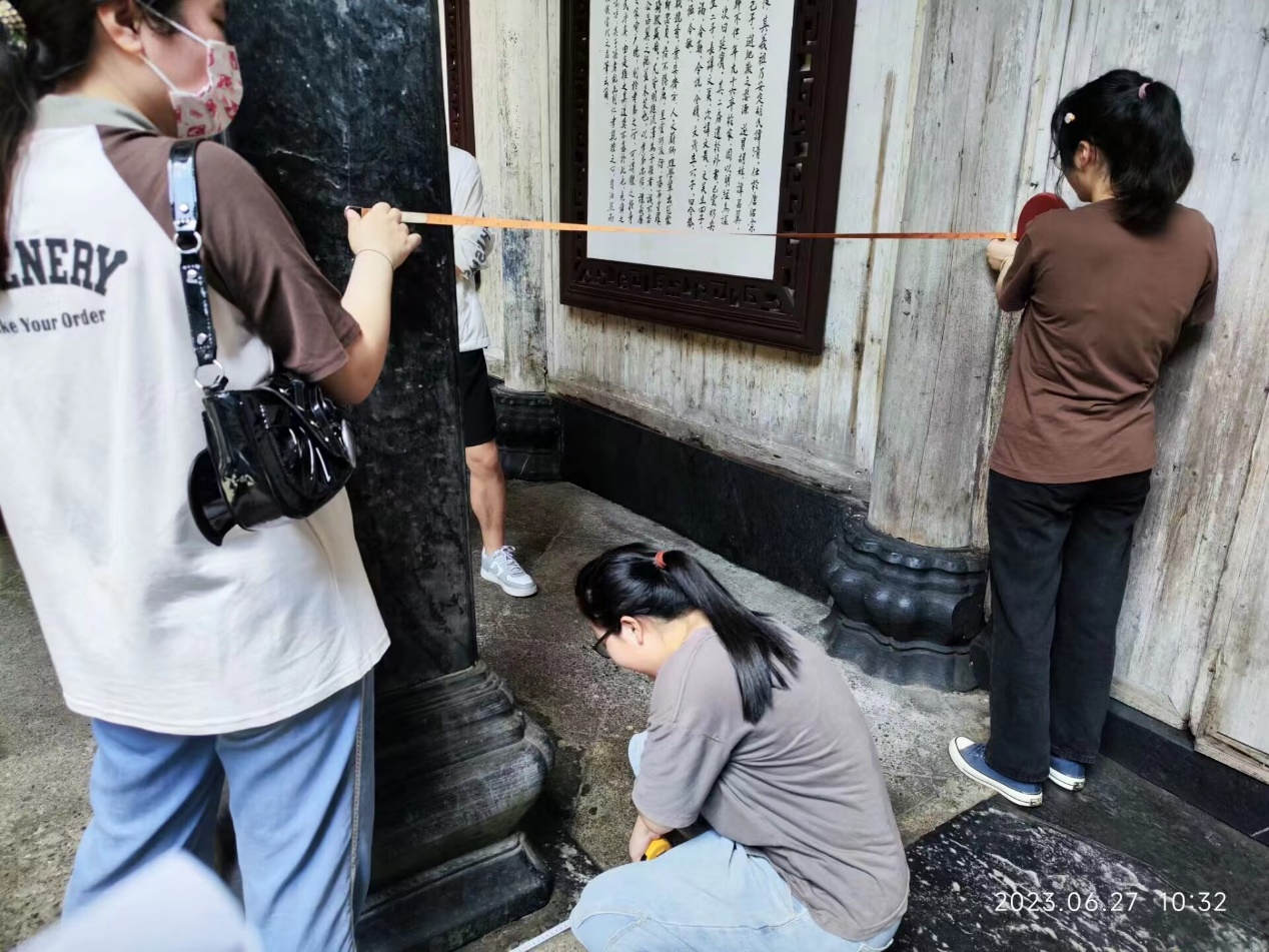 到达各自分配的测绘点后,同学们陆续投入到各自小组古建筑的测绘中。今天各组同学的任务是对所要测绘的古建筑尺寸进行初步测量。下午18时,各组陆续完成了当天的测绘任务。